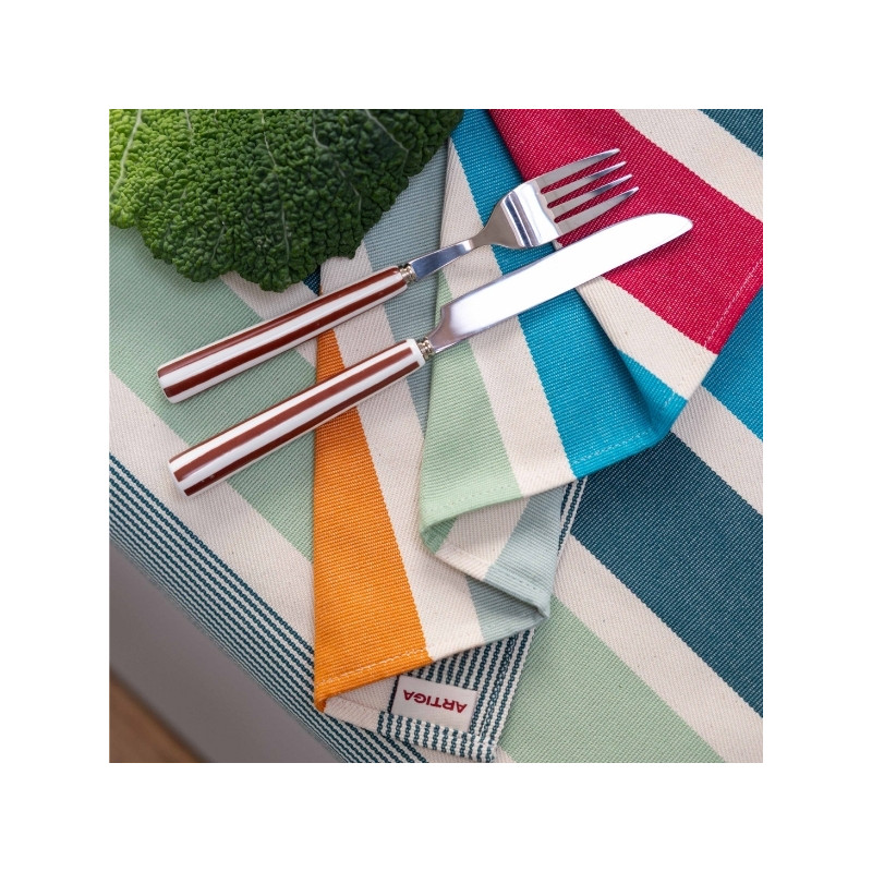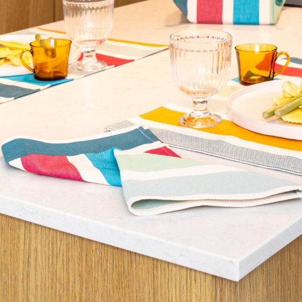 Facile à associer, la serviette Garlin Celadon se marie aussi bien avec une nappe, un jeté ou un set de table assorti qu’avec d’autres coloris rayés Artiga, pour une table vivante et personnalisée. Sa dimension 38 x 38 cm offre un confort idéal à table, tandis que sa résistance au lavage en fait un linge durable, conçu pour durer dans le temps.