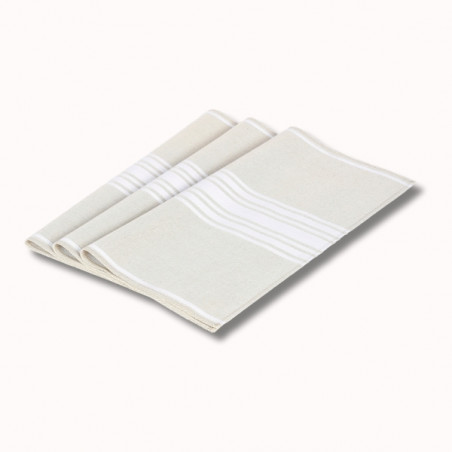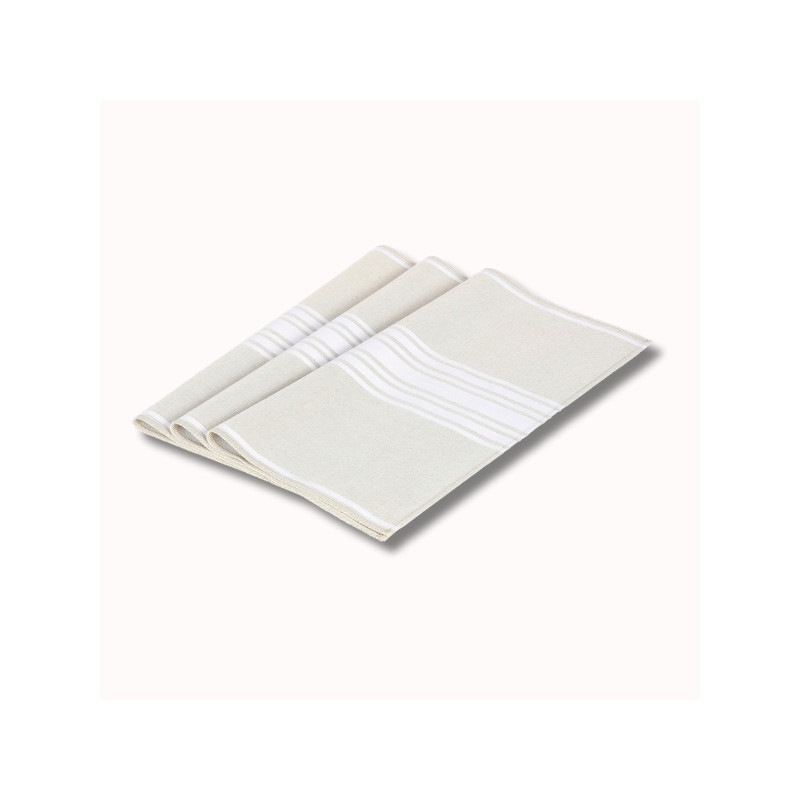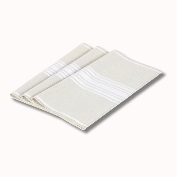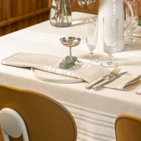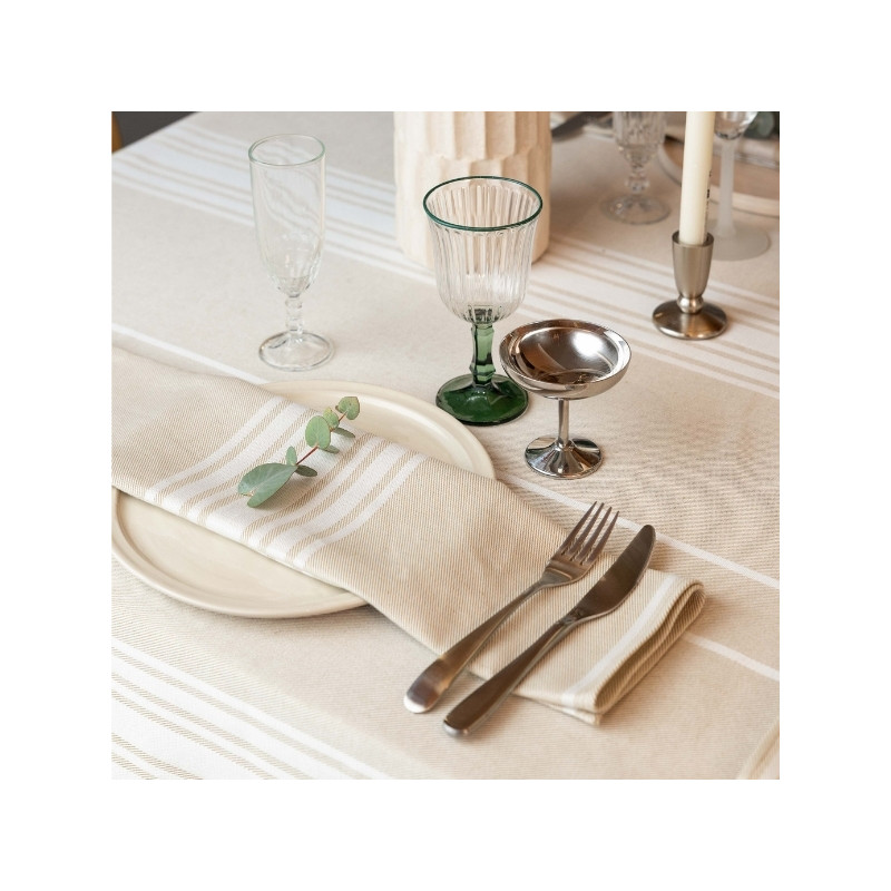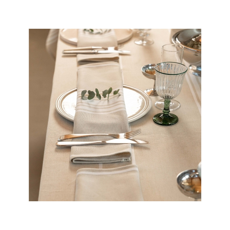 Son design repose sur un fond lin naturel rehaussé de rayures blanches, signature classique et lumineuse qui traverse les tendances sans jamais se démoder. Cette palette douce et équilibrée s’intègre facilement à tous les styles de table, du plus épuré au plus sophistiqué, et se coordonne parfaitement avec les nappes, sets et jetés de la gamme Corda.