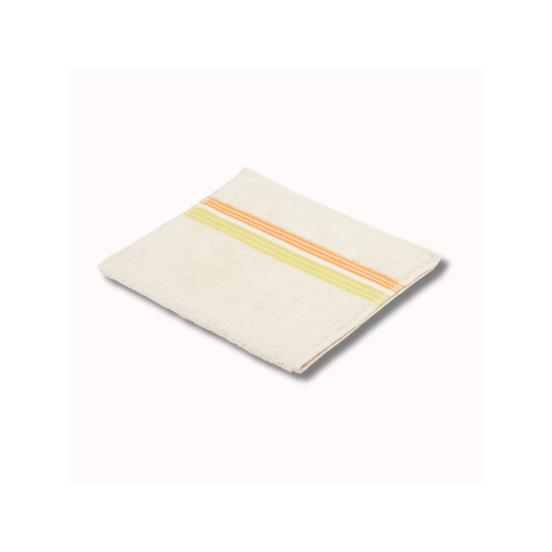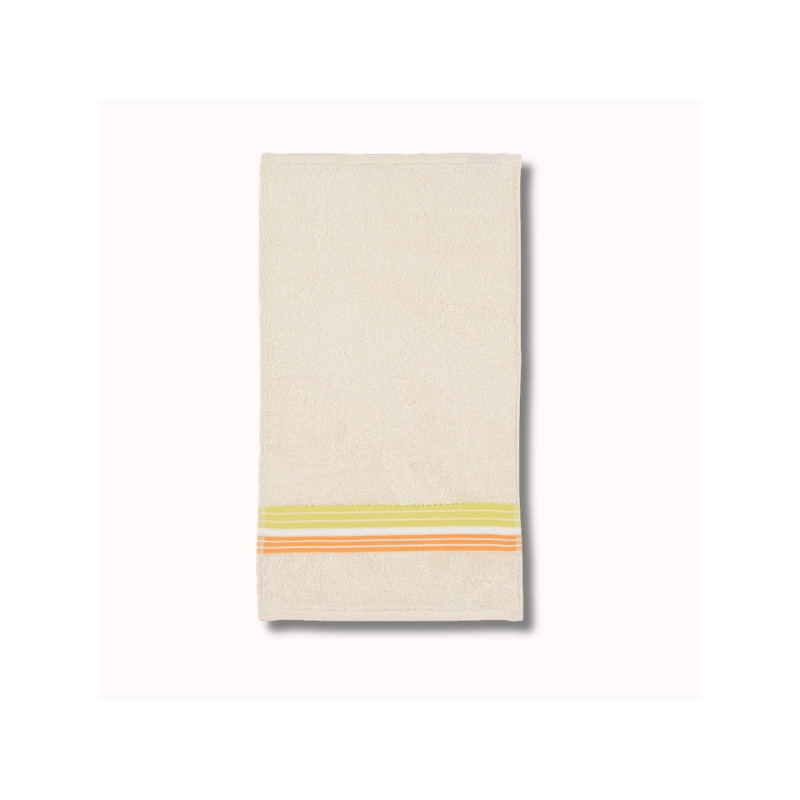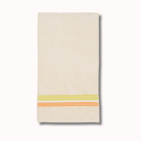 Notre serviette invité, 50 x 30 cm, est en tissu naturel 100% coton. Elle est de couleur écru avec des rayures citron.