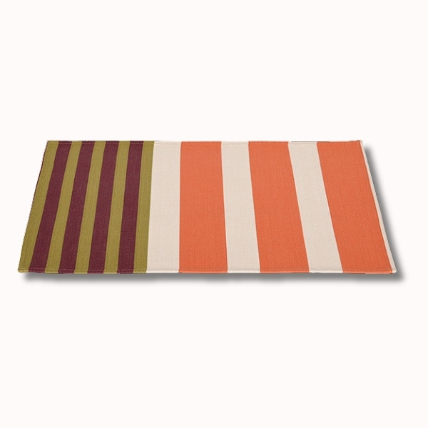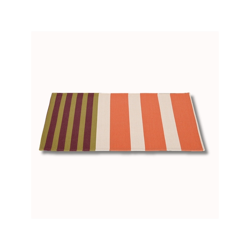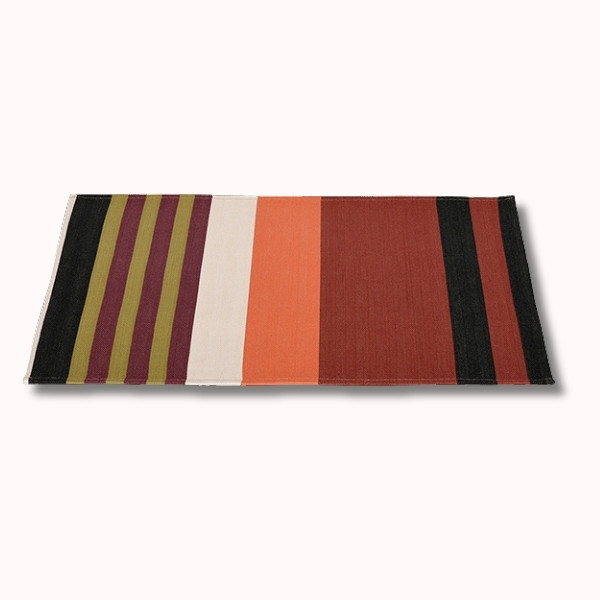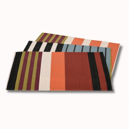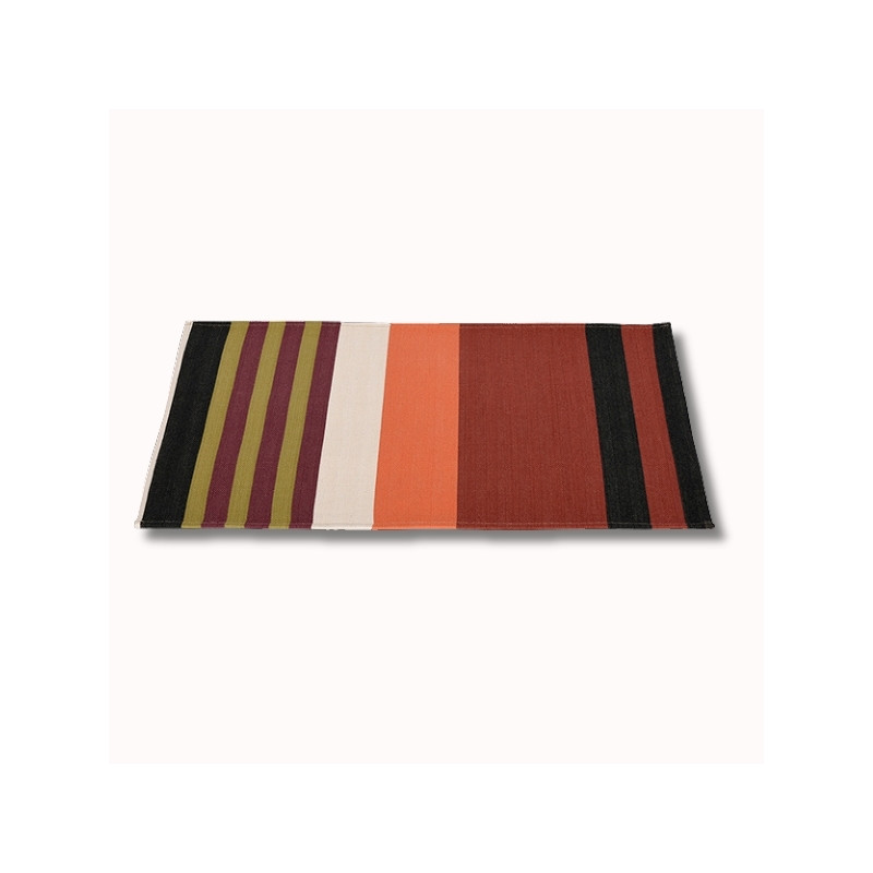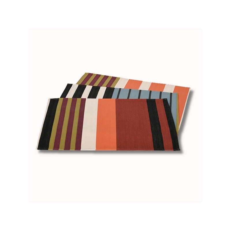 Ses rayures chaleureuses aux tons terracotta, prune, bleu et vert olive insufflent une atmosphère conviviale et élégante à votre décoration de table.