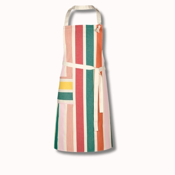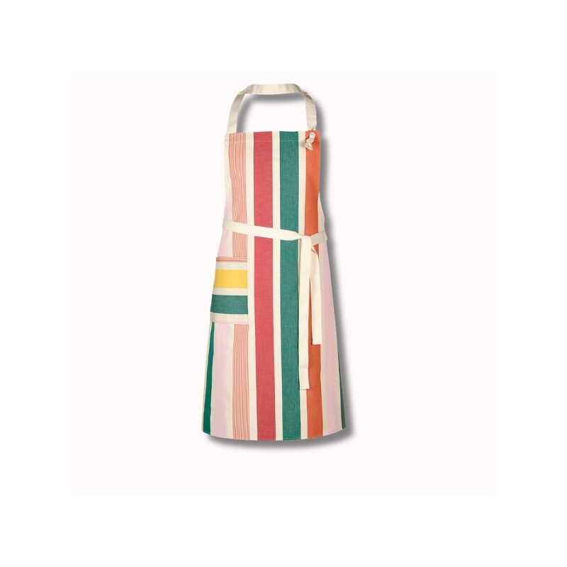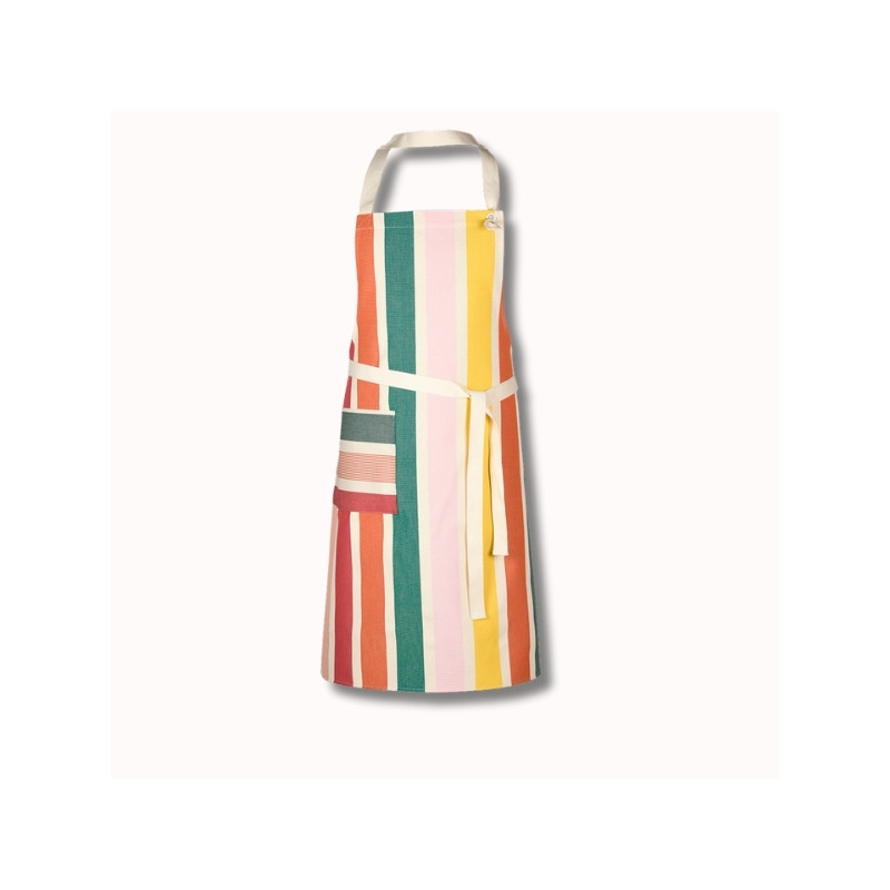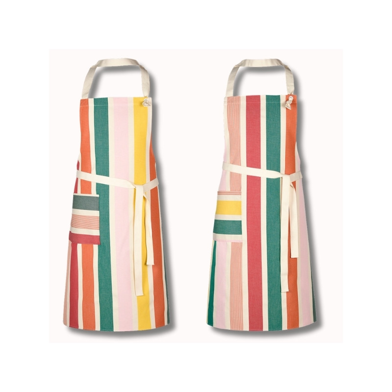 Le motif Garlin Melon, composé de rayures aux teintes fruitées et chaleureuses – melon, framboise, jaune lumineux, rose pâle et verts subtils – insuffle une ambiance fraîche, gourmande et lumineuse. Le placement des rayures sur le tablier peut varier, faisant de chaque pièce un modèle singulier.