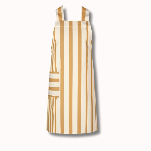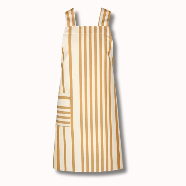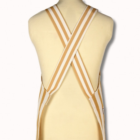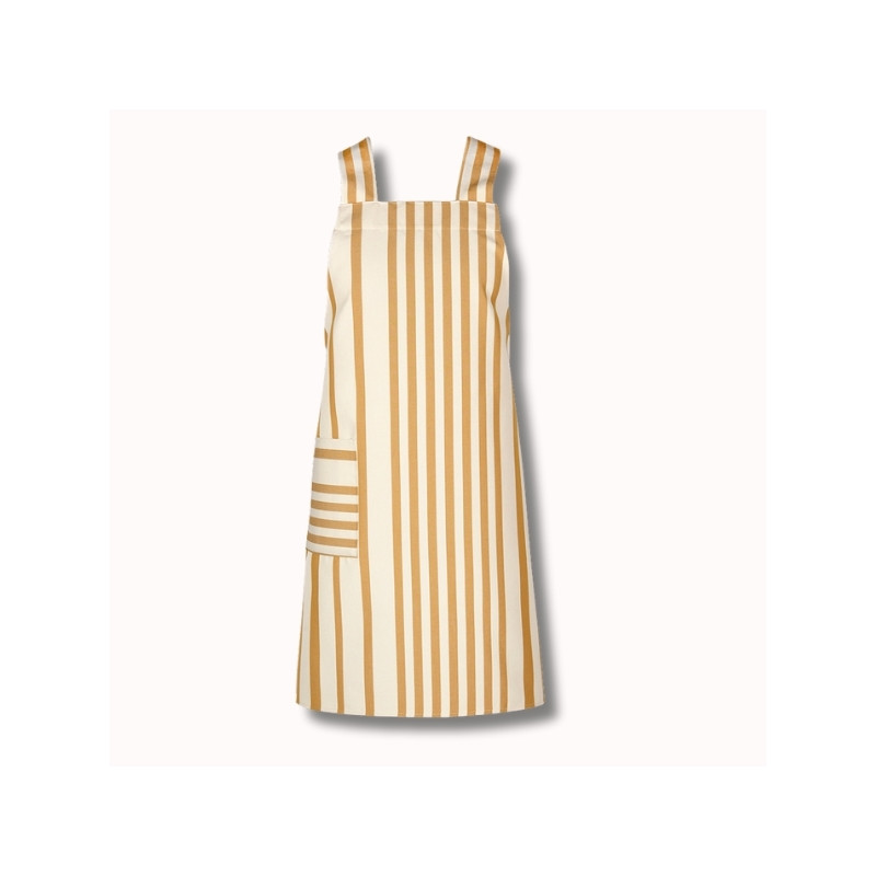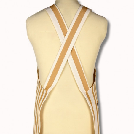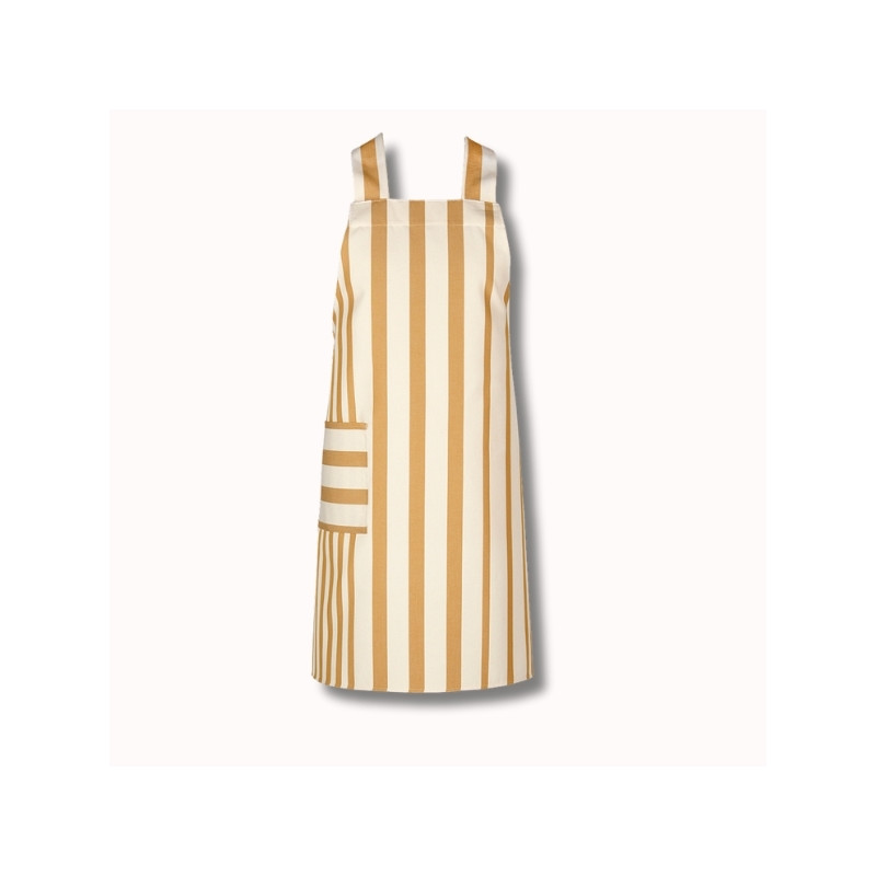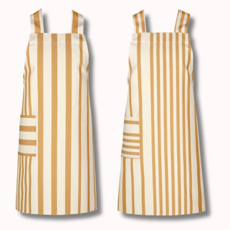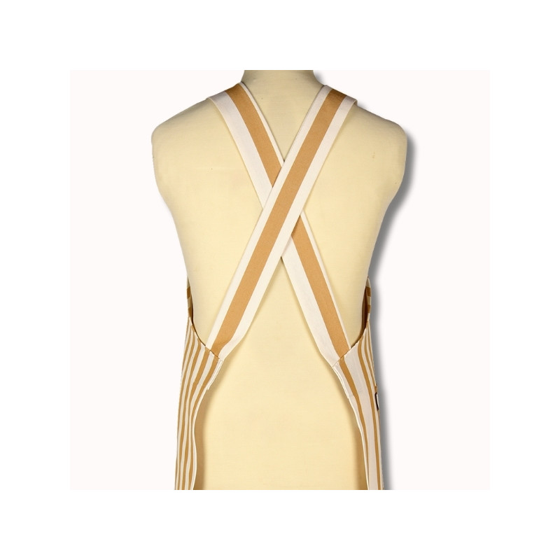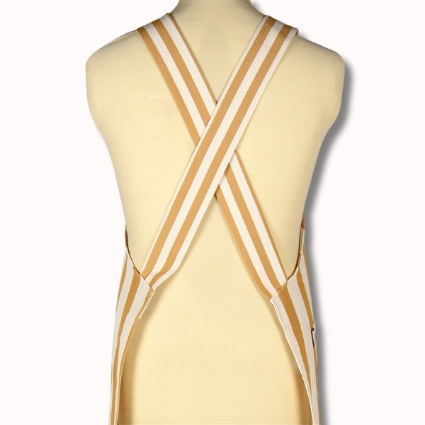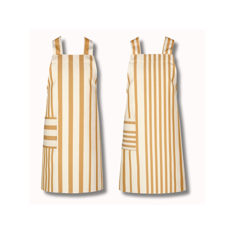 Confectionné en 100 % coton, ce tablier est réalisé à partir de notre toile transat Adour Curry, reconnaissable à ses rayures basques chaleureuses dans des tons curry et écru. Cette toile, à la fois résistante, respirante et agréable au toucher, est idéale pour un usage régulier.
