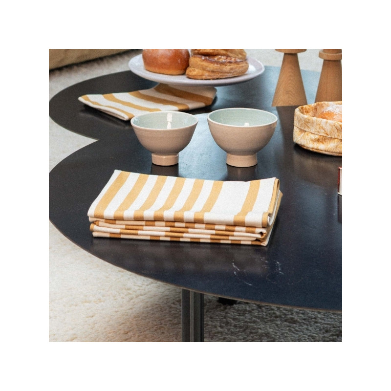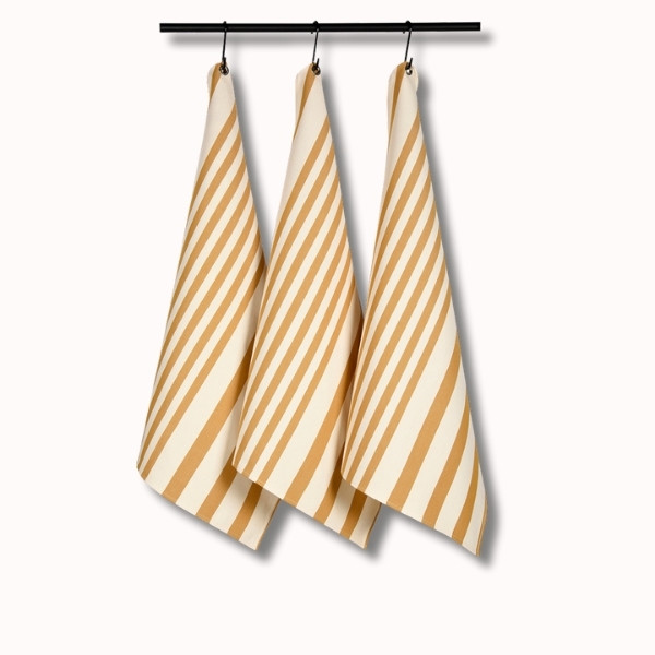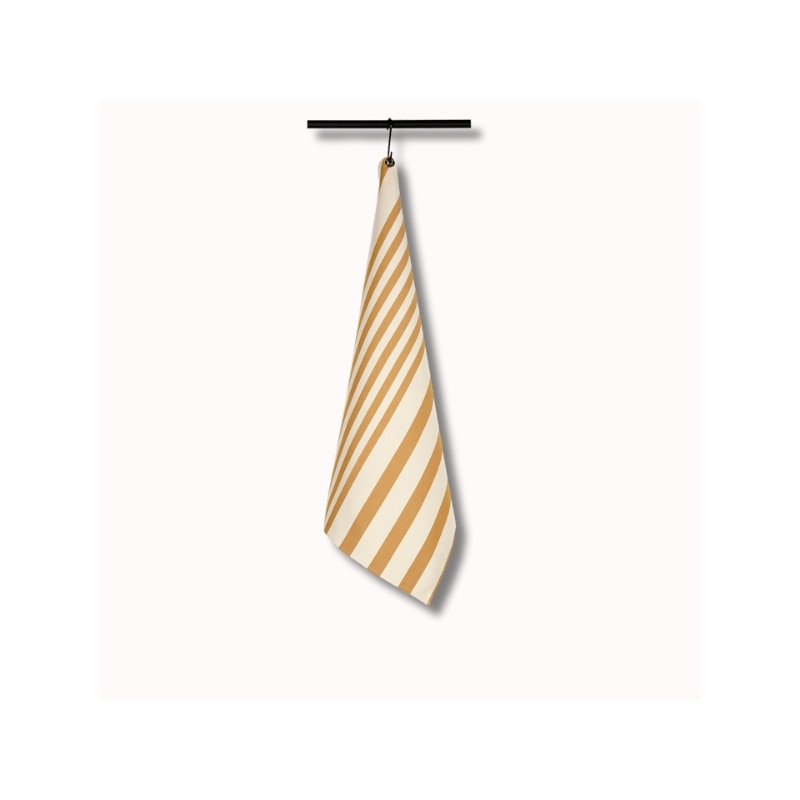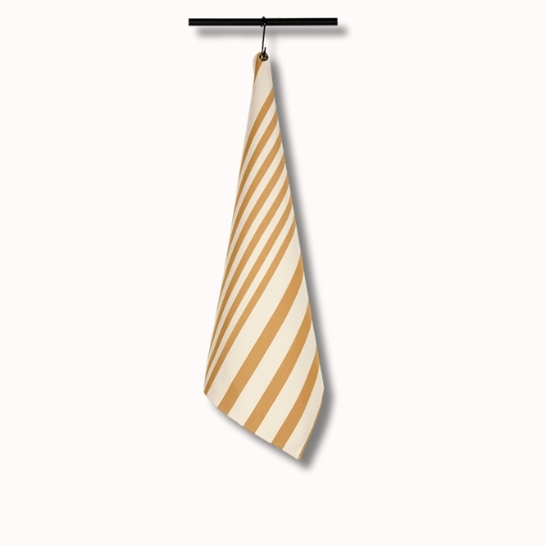 Ses rayures curry sur fond écru apportent une touche chaleureuse et naturelle à la cuisine, tout en conservant une esthétique sobre et raffinée.