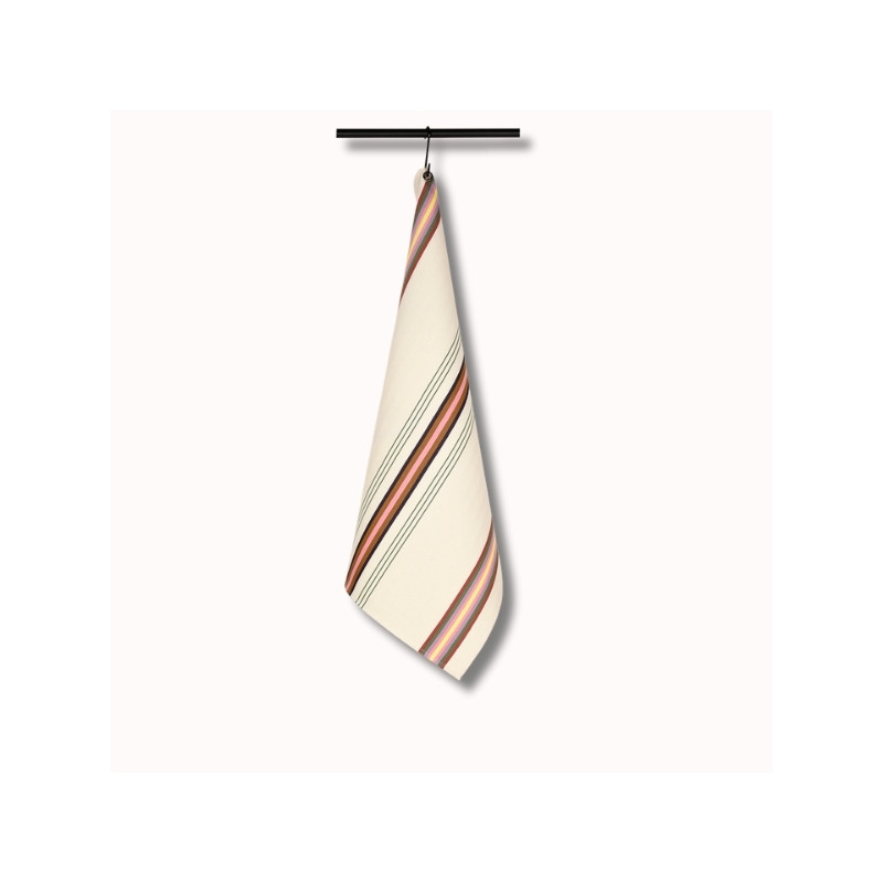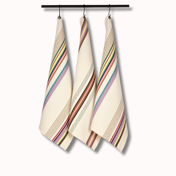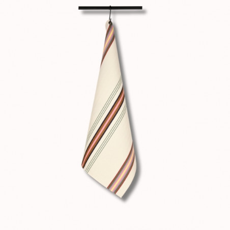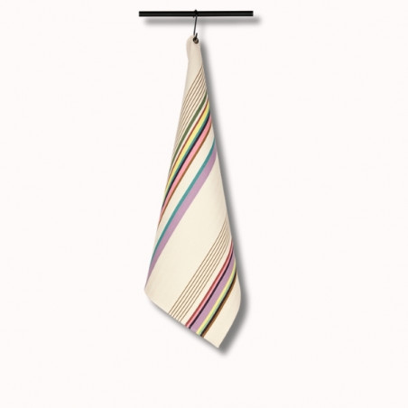 Le motif SORE se distingue par ses rayures fines et équilibrées, associant des teintes citronnées, fleuries et naturelles sur un fond écru. Le motif du torchon peut varier, apportant un charme authentique et vivant à votre linge de cuisine.