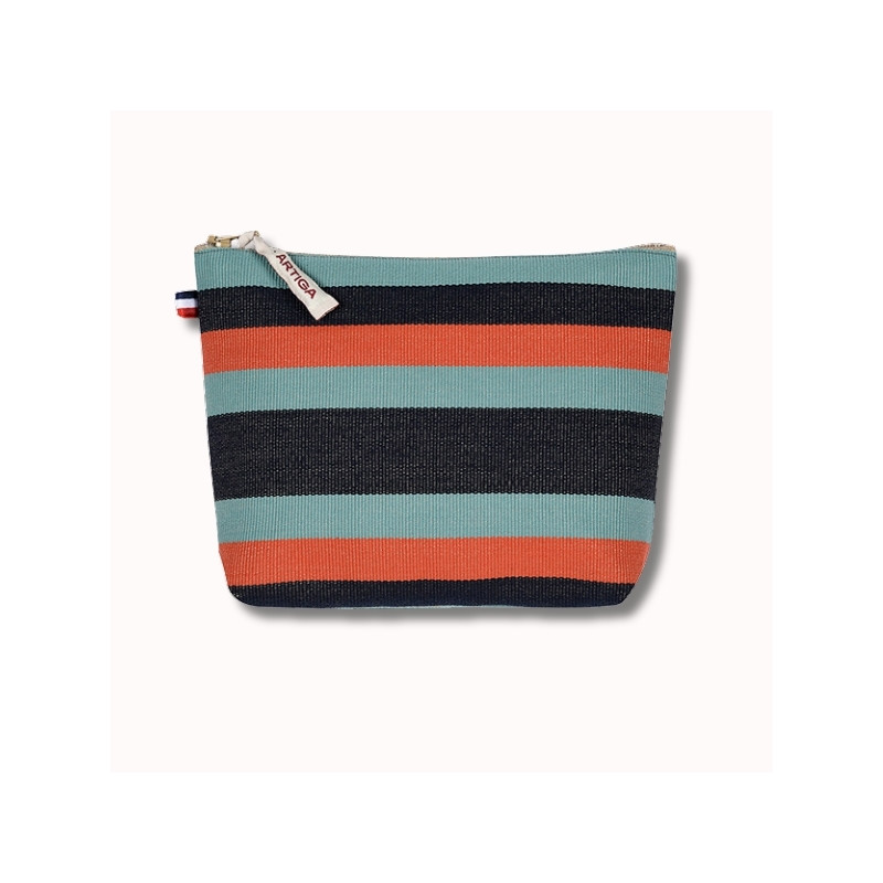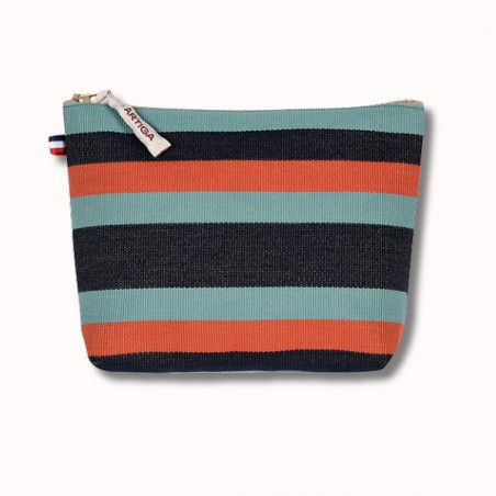 Compacte avec son format de 13x18 cm, elle se glisse facilement dans un sac à main ou une valise. Sa fermeture zippée garde vos cosmétiques, accessoires ou petits effets personnels bien protégés. Les rayures colorées emblématiques de la collection lui confèrent un charme unique, fidèle à l’art de vivre du Sud-Ouest.