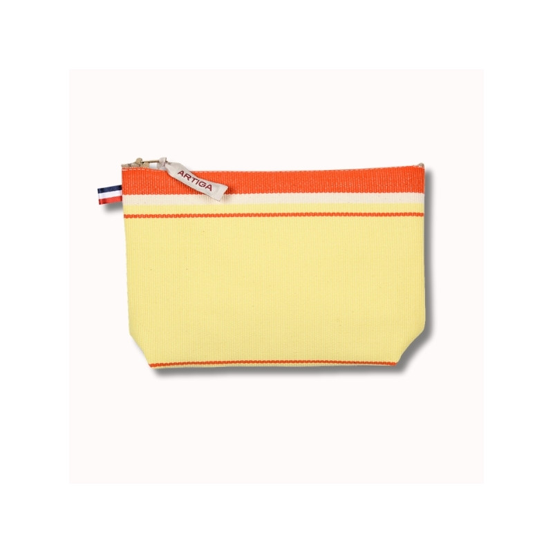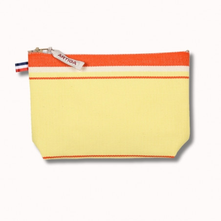 La trousse à maquillage Bouillon est un accessoire pratique et lumineux, confectionné en toile espadrille. Son format 13 x 18 cm permet de ranger facilement vos indispensables beauté tout en restant compact. Son design rayé aux teintes jaune ananas, orange vif et écru apporte une touche solaire et élégante. Dotée d’une fermeture zippée solide, elle est fabriquée en France et reflète le savoir-faire artisanal Artiga.