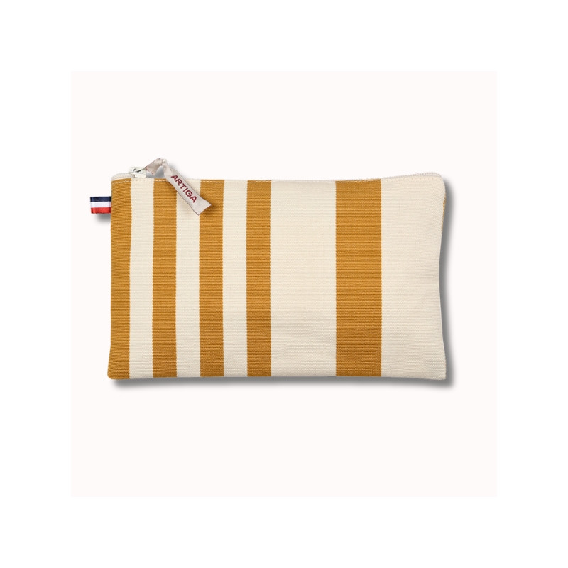 Confectionnée à partir de nos toiles transat rayées écru et curry, cette trousse associe une base écrue naturelle à des rayures curry aux tons chauds. Un équilibre subtil qui s’intègre facilement dans tous les univers, du quotidien aux escapades.
