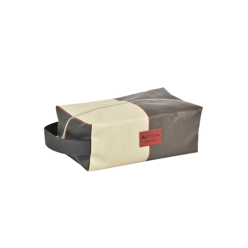 Cette trousse de toilette moyen format Chevron Brique, 24.5 x 10 x 14 cm, en toile 100% coton avec traitement imperméable et ciré, a été créée et confectionnée dans notre atelier situé dans le Sud-Ouest, dans le respect des tissages traditionnels basques.